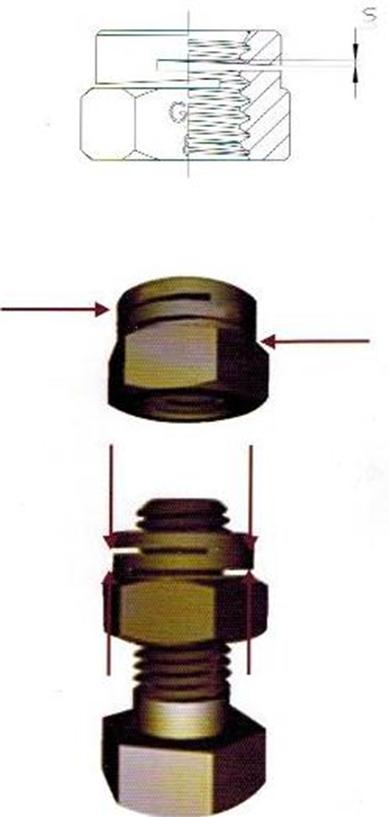 開槽鎖緊螺母的鎖緊槽經精密加工而成,使內螺紋產生一距差。當螺栓旋入時,內螺紋回復原有螺距,發生彈性生的彈性力將內外螺紋緊密嚙合,使螺母牢固的自鎖螺栓有一種對稱開槽的設計,可使鎖緊力均衡分布在上,使嚙齒更緊密,適合于震動更劇烈的應用.